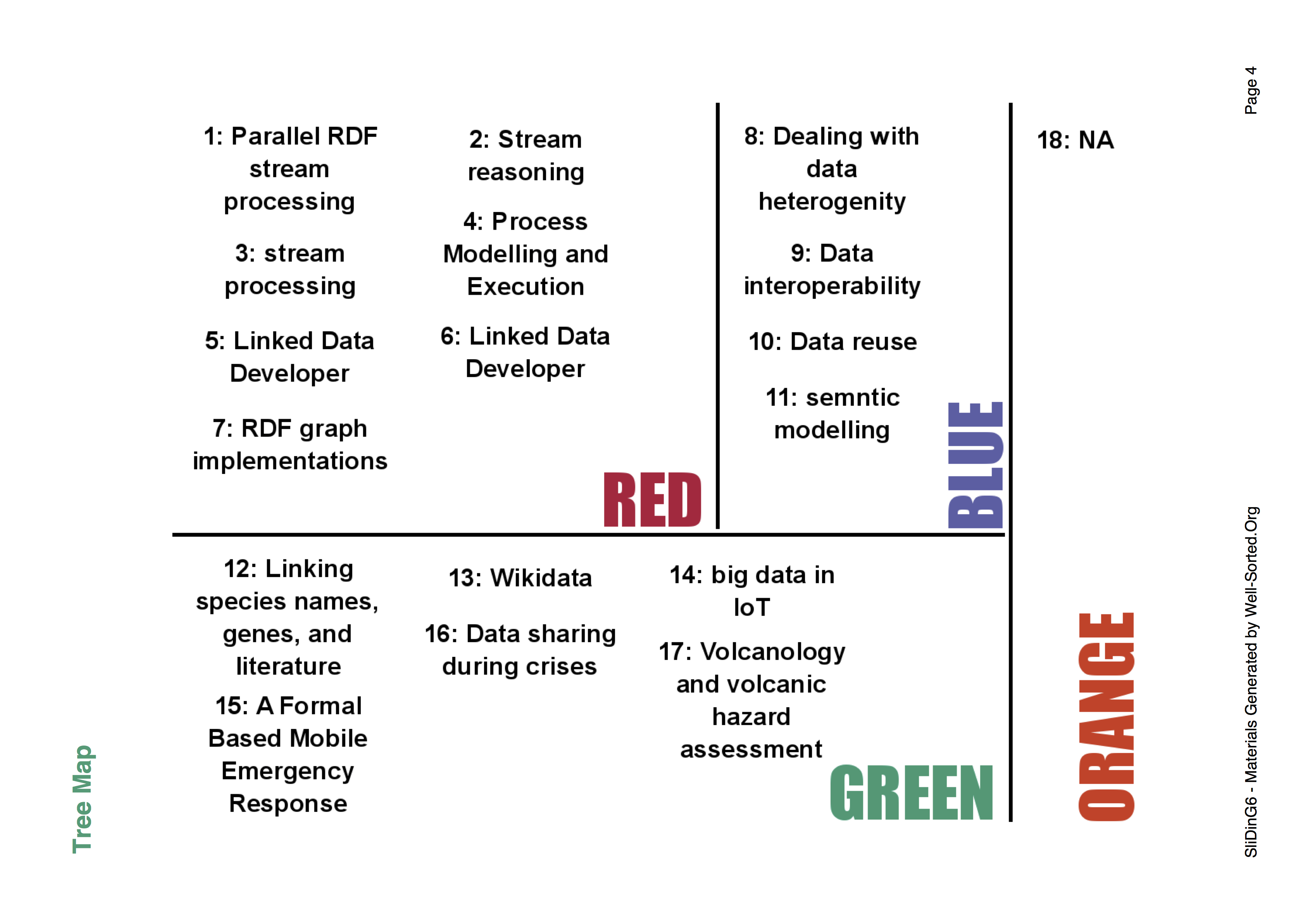 The main focus of the day was to share interests and knowledge around Semantic Web and Linked Data research and use across Scotland, with a view to fostering collaboration and interaction. We asked all attendees to fill out a well-sorted form two weeks prior to the event. Well Sorted allows attendees of events to put in titles and short descriptions of their interests. Once these are all received, attendees group them according to their own view of how they interact. The Well Sorted algorithm then takes all sortings and creates themed groups. Attendees were allowed to submit up to two responses. We received 17 responses, which were sorted into three groups as shown in the figure below. The full well-sorted results can be found here.