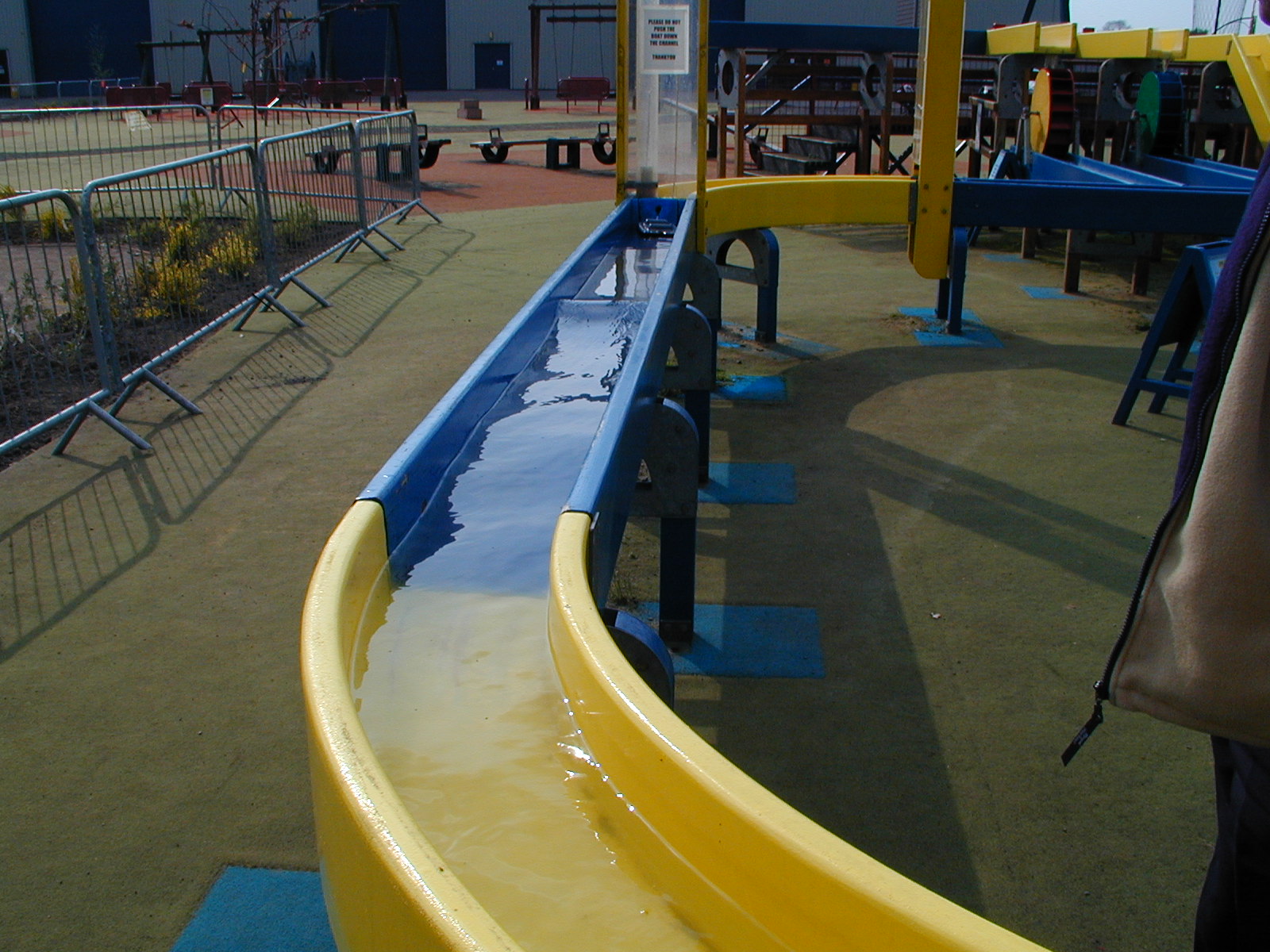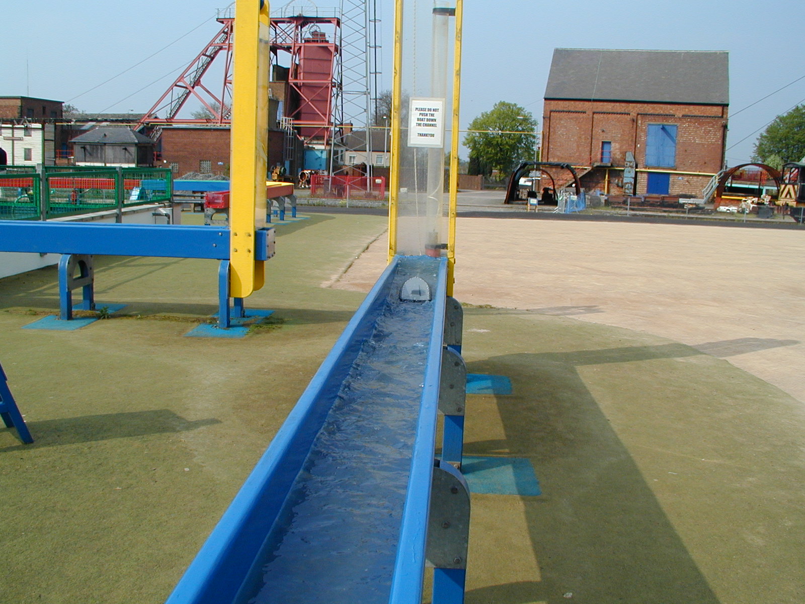 After the tour I took a look around part of the rest of the exhibits and found a system for producing John Scott Russell's wave! If you take a look at the attached images you will see that they have a system with weights and pulleys for pulling different hull designs along a series of troughs. In the first image you will see a conventional hull design almost at the end of the pull from the rope as the weight has fallen to the bottom of the tube. The wave that the hull created is in front of the hull and it bounced back and travelled back up the trough as a perfect solitary wave. See the second image of it as it has turned the corner and is going up a second straight. (The trough is painted wood). The third image shows the whole wave creating assembly with the old colliery winding gear in the background. (Paul this looks like the almost the perfect system for illustrating the wave - you could improve it by having the hull stop short of the end of the trough and the wave would carry on to the end - the pulley gear could be located at a point along the trough instead of at the end).