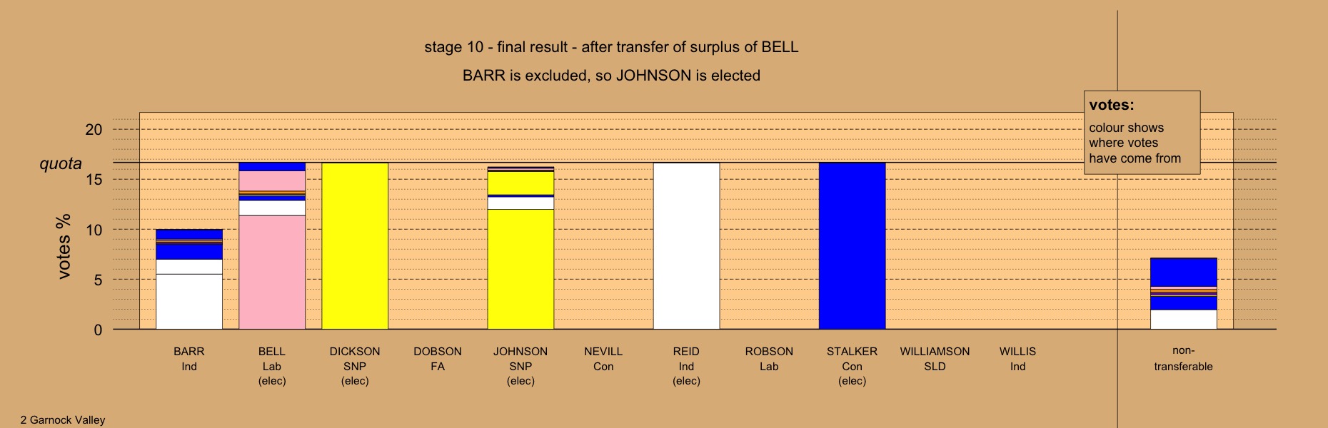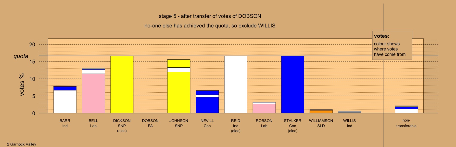 Elected: Donald L REID (Ind), Ronnie STALKER (Con), Anthea DICKSON (SNP), John BELL (Lab), Margaret JOHNSON (SNP) |