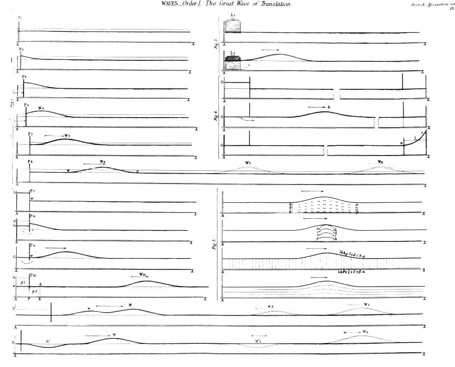Plates XLVII-LVII).``I was observing the motion of a boat which was rapidly drawn along a narrow channel by a pair of horses, when the boat suddenly stopped - not so the mass of water in the channel which it had put in motion; it accumulated round the prow of the vessel in a state of violent agitation, then suddenly leaving it behind, rolled forward with great velocity, assuming the form of a large solitary elevation, a rounded, smooth and well-defined heap of water, which continued its course along the channel apparently without change of form or diminution of speed. I followed it on horseback, and overtook it still rolling on at a rate of some eight or nine miles an hour, preserving its original figure some thirty feet long and a foot to a foot and a half in height. Its height gradually diminished, and after a chase of one or two miles I lost it in the windings of the channel. Such, in the month of August 1834, was my first chance interview with that singular and beautiful phenomenon which I have called the Wave of Translation''.