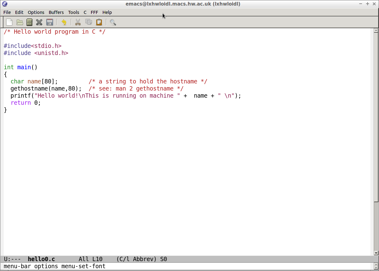 Our goal is to add the name of the machine we are running this program on to the string that is displayed. This is a simple step of customisation to our working environment. First we copy the file hello.c to hello0.c, for our new program, and we start the editor on this new file: