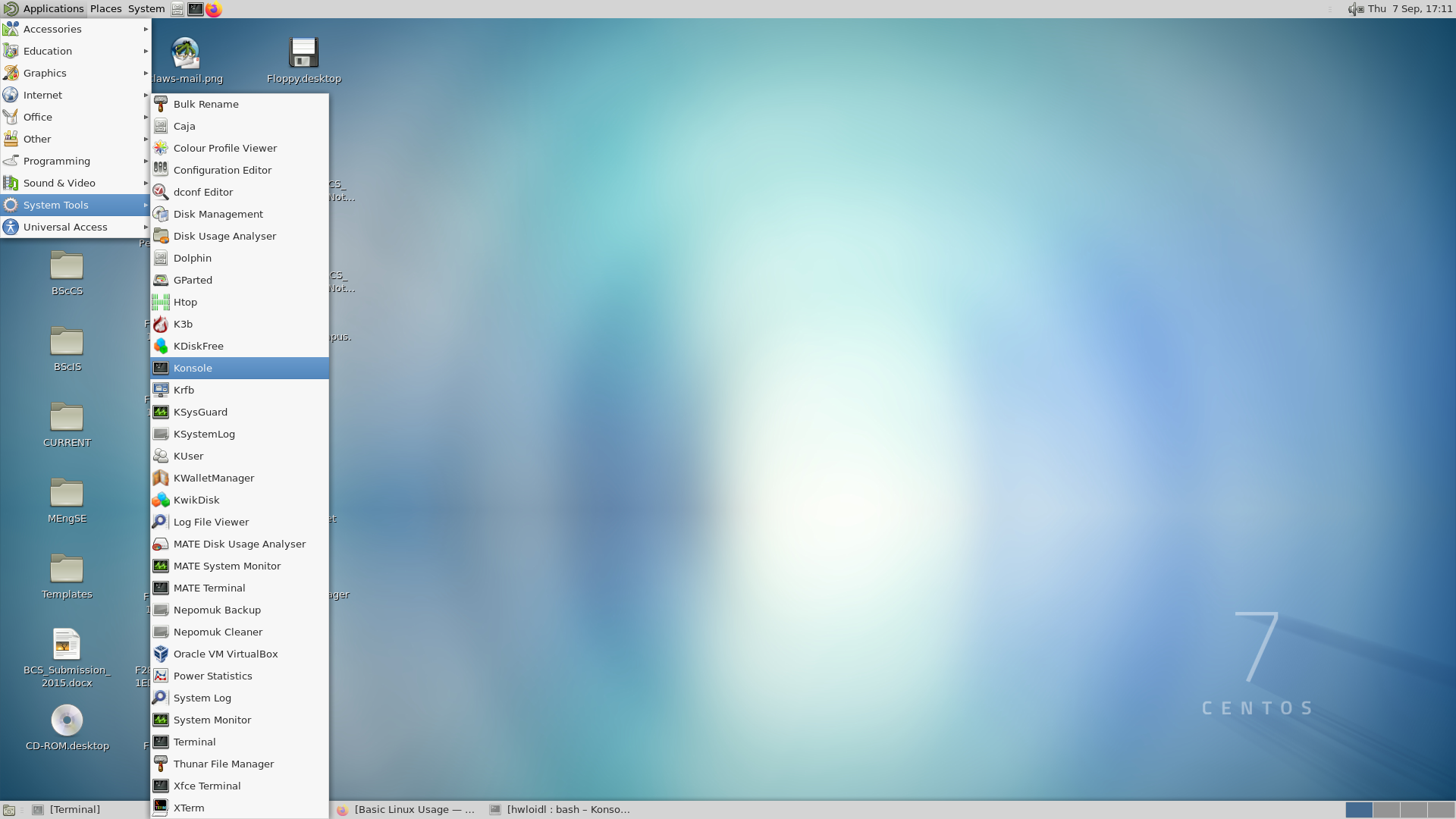 Once you have logged in, either directly or remotely on the lab machine or into the VM, you need to set up your working environment. Next you probably want to start an application. If you plan to do the body of this Linux Introduction, you want to start a Terminal window. To do so, click at the main menu account at the bottom left of the screen. This will pull up another menu. Select System Tools on this menu, which will pull up another menu. Select Terminal on that menu. Here is a screenshot of that stage in the clicking: