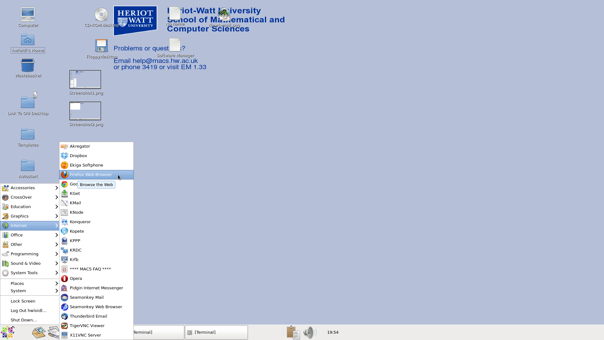 Once you have opened the Terminal window you can start typing commands, as instructed in the Linux Introduction. Best use a web browser side-by-side with the Terminal window to go through the Introduction document. To start a web browser, again click at the main menu, select Internet, then Firefox, as shown below: