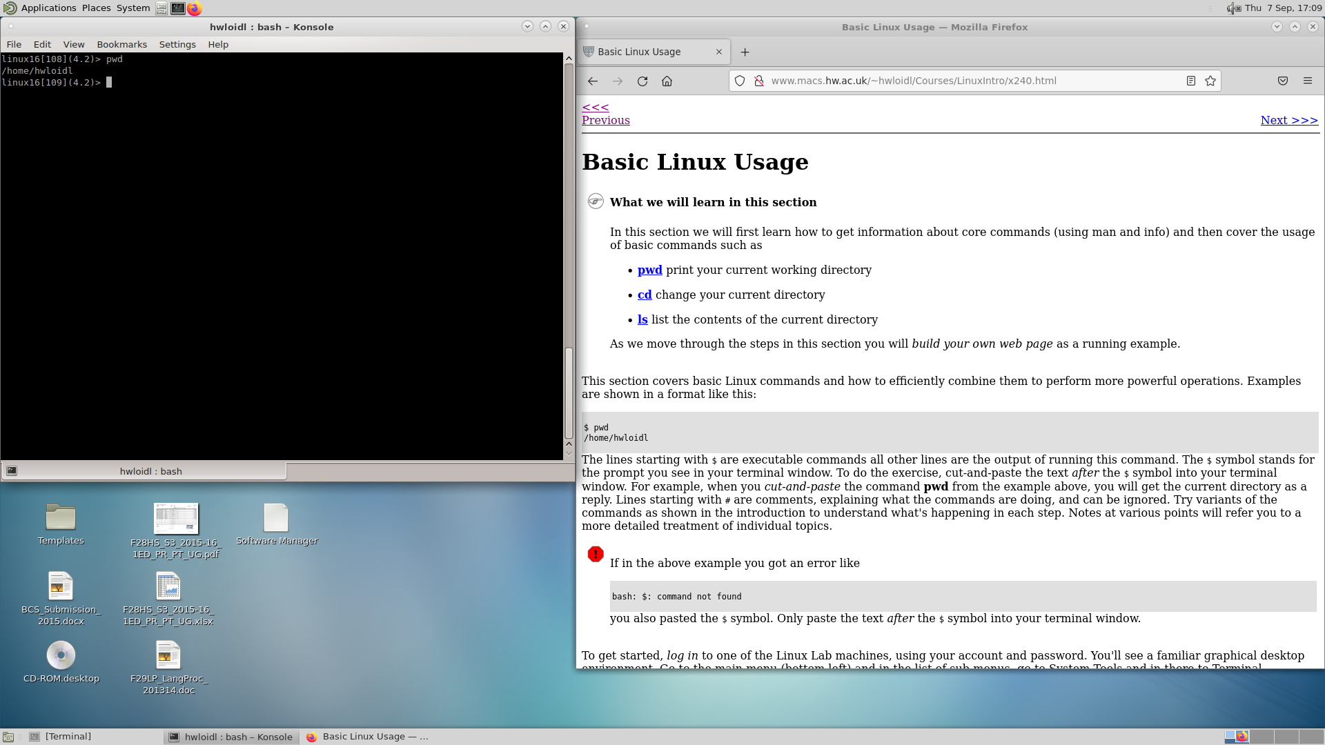 Now you can work through the Linux Introduction, starting with the Section called Basic Linux Usage. Use the Terminal window and the Web browser side-by-side, and type in the relevant commands (or cut-and-paste from the browser into the Terminal window).