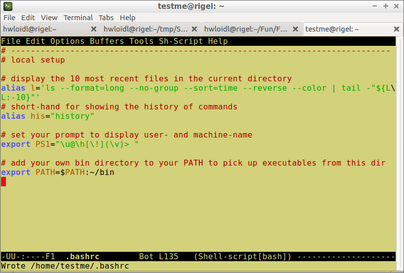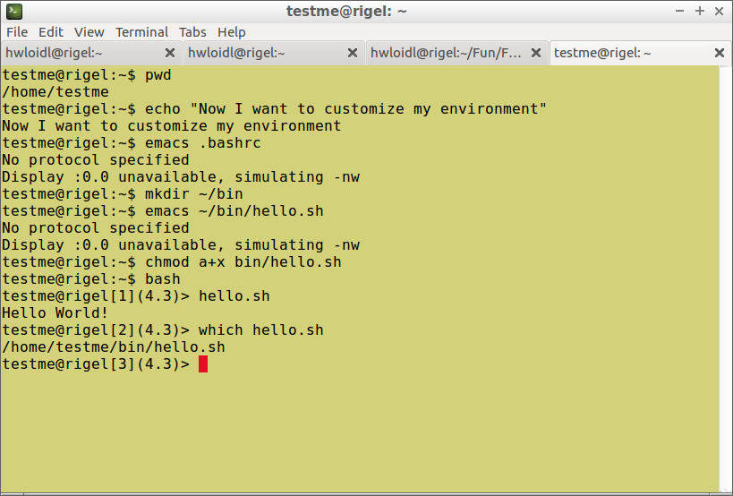 To test that the changes are in effect, start a new shell by typing bash and then execute one of the new commands, such as his, or execute a file in your ~/bin directory, such as hello.sh, like this: