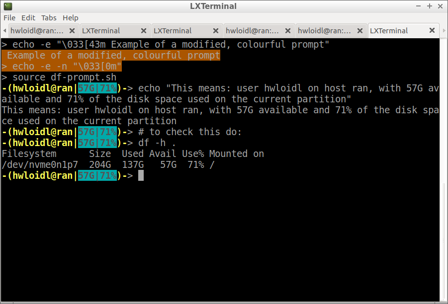 As an advanced exercise, modify your prompt on the command line, so that it shows the user-name, the host-name, as well ass the available disk space and disk utilisation on the current partition. Use colour background to high-light the last 2 pieces of information. Once implemented correctly, you should see a prompt as in the picture below. First, test your solution by directly changing prompt on the command-line using