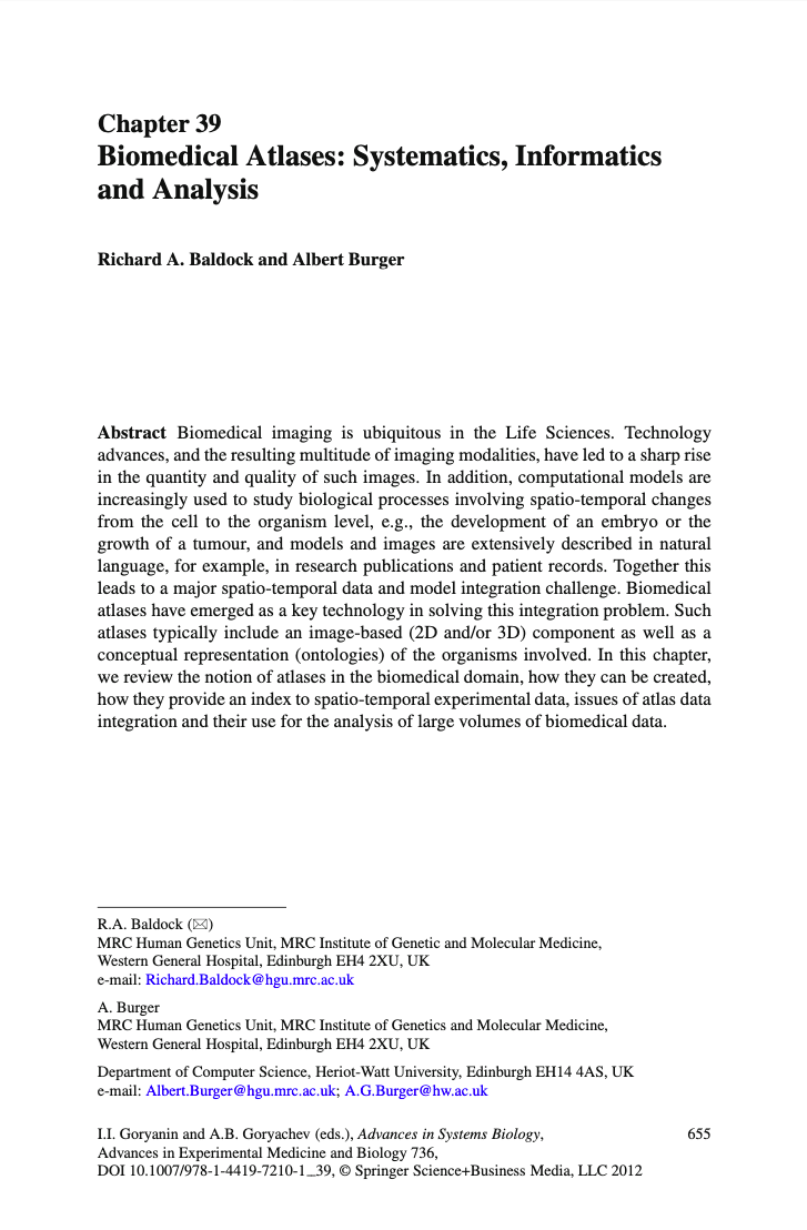 - Biomedical Atlases: systematics, informatics and analysis. Richard Baldock, Albert Burger. Advances in experimental medicine and biology, 736 (2012) 655–677. 2012. [pdf]