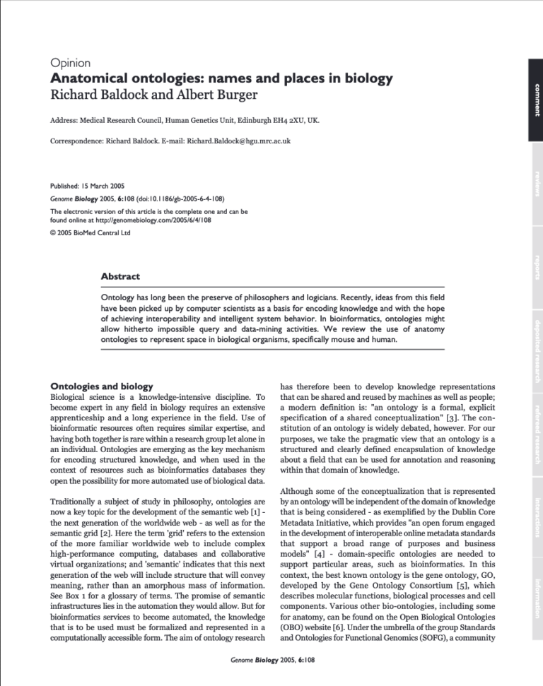 - Anatomical Ontologies: Names and Places in Biology. Richard Baldock and Albert Burger. Genome Biology, 6:108, 2005. [pdf]