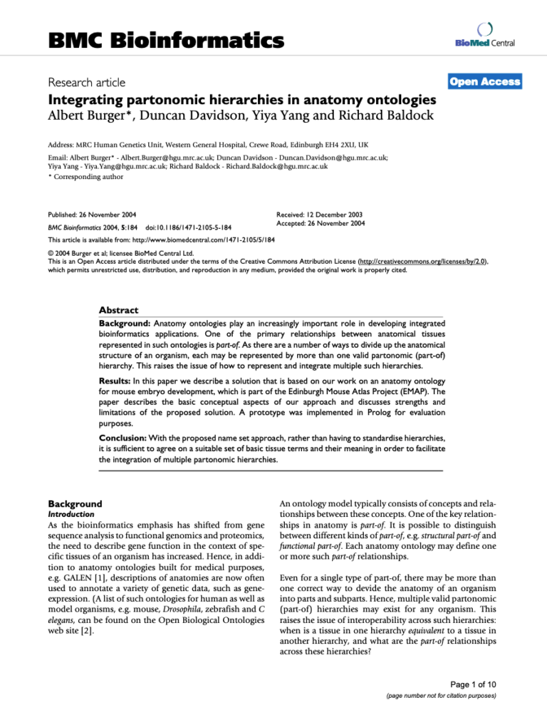 - Integrating partonomic hierarchies in anatomy ontologies, Albert Burger, Duncan Davidson, Yiya Yang and Richard Baldock, BMC Bioinformatics, 5:184, 2004. [pdf]