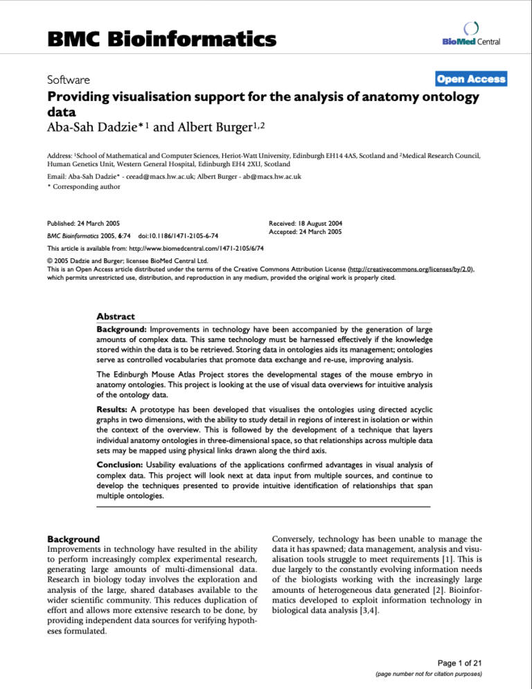 - Providing visualisation support for the analysis of anatomy ontology data. Aba-Sah Dadzie and Albert Burger, BMC Bioinformatics, 6:74, 2005. Online: http://www.biomedcentral.com/1471-2105/6/74. [pdf]