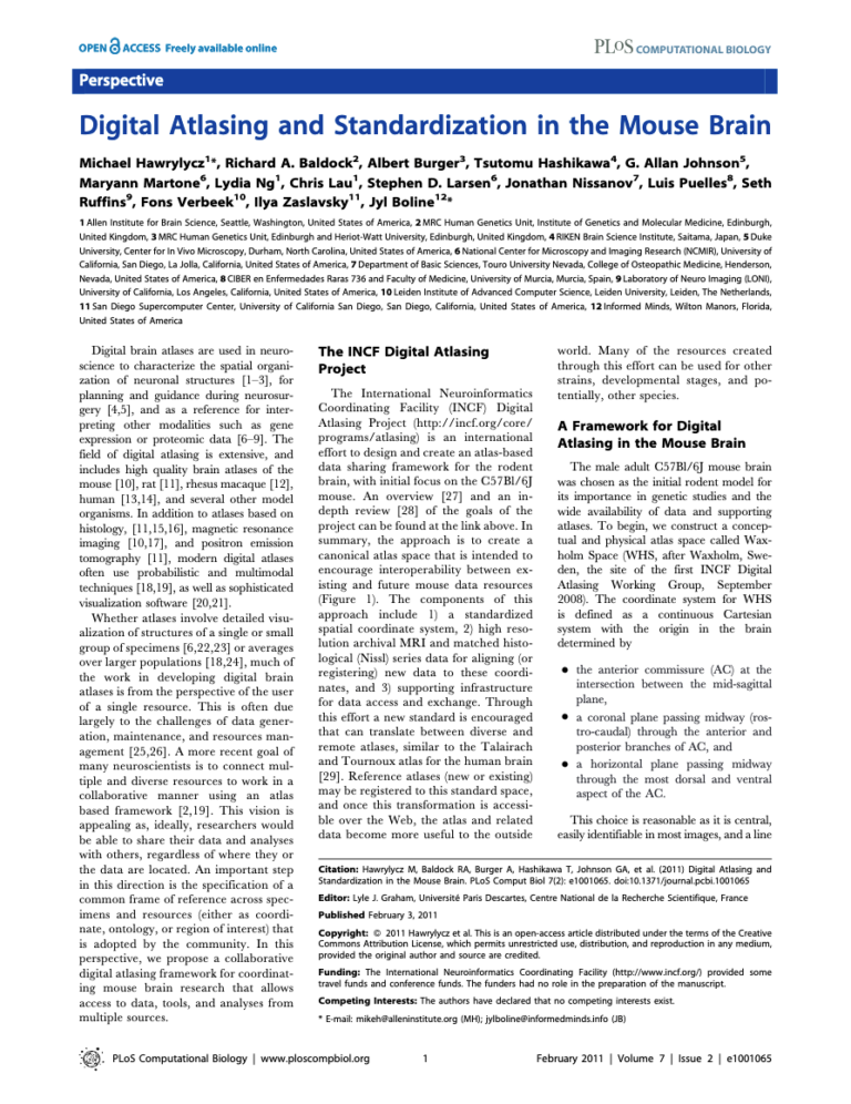 - Digital atlasing and standardisation in the mouse brain. Michael Hawrylycz, Richard A. Baldock, Albert Burger, Tsutomu Hashikawa, G. Allen Johnson, Maryann Martone, Lydi Ng, Chris Lau, Stephen Larsen, Jonathon Nissanov, Luis Puelles, Seth Ruffins, Fons Verbeek, Ilya Zaslavsky and Jyl Boline. PLOS Computational biology, 7(2): e1001065. 2011. [pdf]