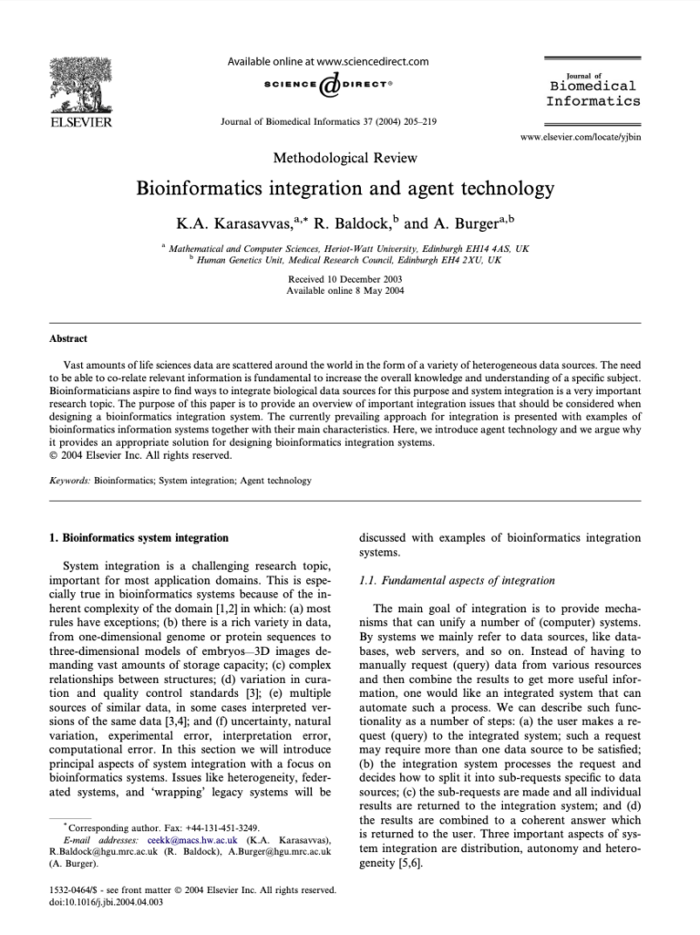 - Bioinformatics Integration and Agent Technology, Konstantinos Karasavvas, Richard Baldock and Albert Burger, Journal of Biomedical Informatics, Vol 37/3, pp 205-219, 2004. [pdf]