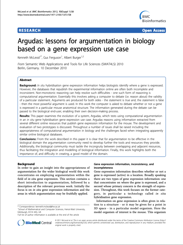 - Argudas: lessons for argumentation in biology based on a gene expression use case, Kenneth McLeod, Gus Ferguson and Albert Burger, BMC Bioinformatics 2012, 13(Suppl 1):S8, 2012. [pdf]
