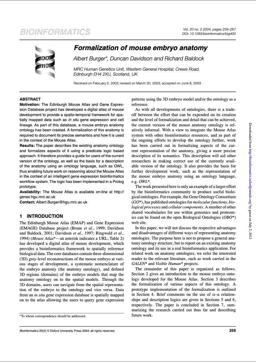 - Formalization of mouse embryo anatomy, Albert Burger, Duncan Davidson and Richard Baldock. Bioinformatics Journal , Volume 20, No 2, pp 259-267, January 2004. [pdf]