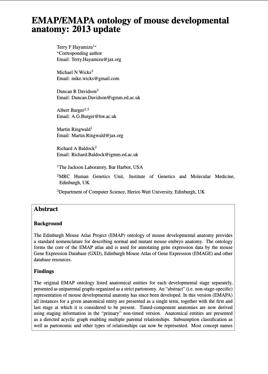 - EMAP/EMAPA ontology of mouse developmental anatomy: 2013 update. Hayamizu T.F., Wicks, M.N., Davidson, D.R., Burger, A., Ringwald, M. and Baldock, R. In Journal of Biomedical Semantics, 2013, 4:15 [pdf]