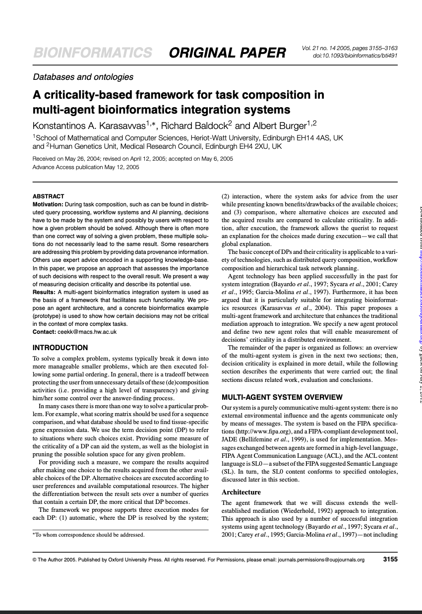 - A Criticality-Based Framework for Task Composition in Multi-Agent Bioinformatics Integration Systems. Konstantinos Karasavvas, Richard Baldock and Albert Burger. Bioinformatics Journal, Volume 21, No 14, pp 3155-3163, 2005. PubMed ID: 15890745. [pdf]